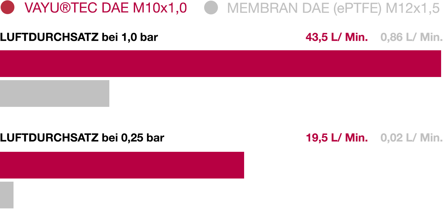 Sollen somit ca. 20 Liter Luft pro Minute bei einem Druckunterschied von 0,25 bar ausgeglichen werden, so braucht es dafür 975 Druckausgleichselemente mit ePTFE Membran: oder genau ein einziges mit einem IQTEX Laminat! Ein deutlicher Kostenvorteil für VAYU TEC. Mal abgesehen davon, dass 975 ePTFE-Druckausgleichselemente ungleich mehr Platz brauchen als ein VAYU TEC Element.
